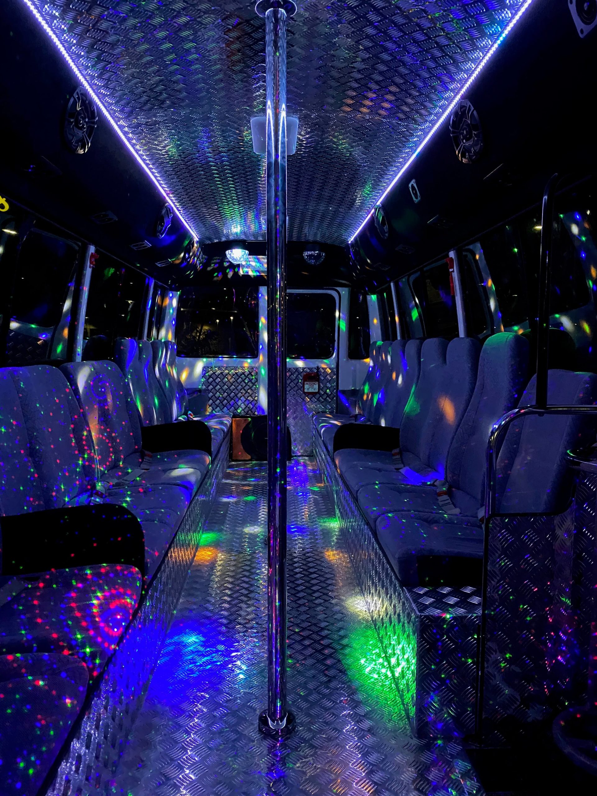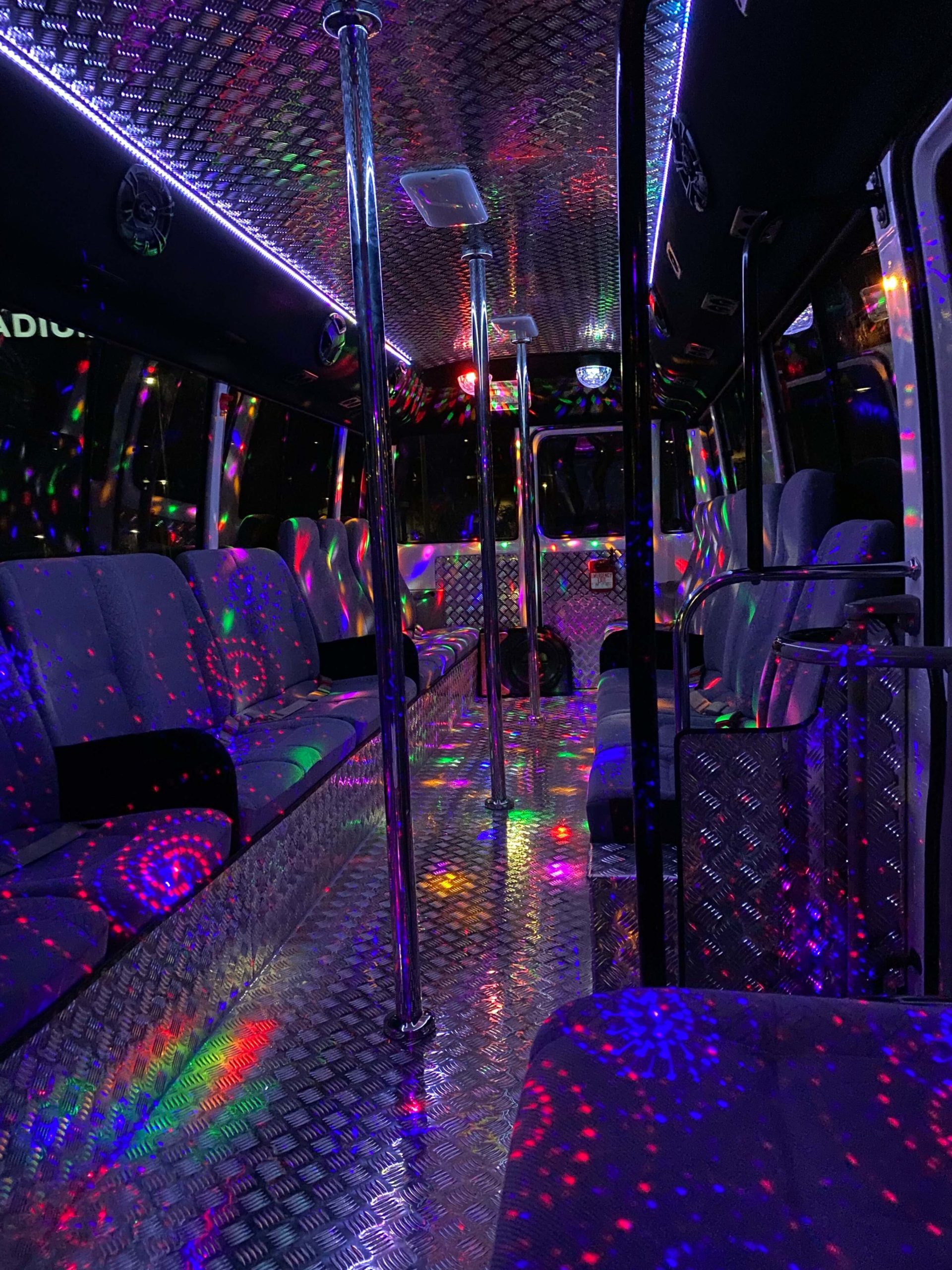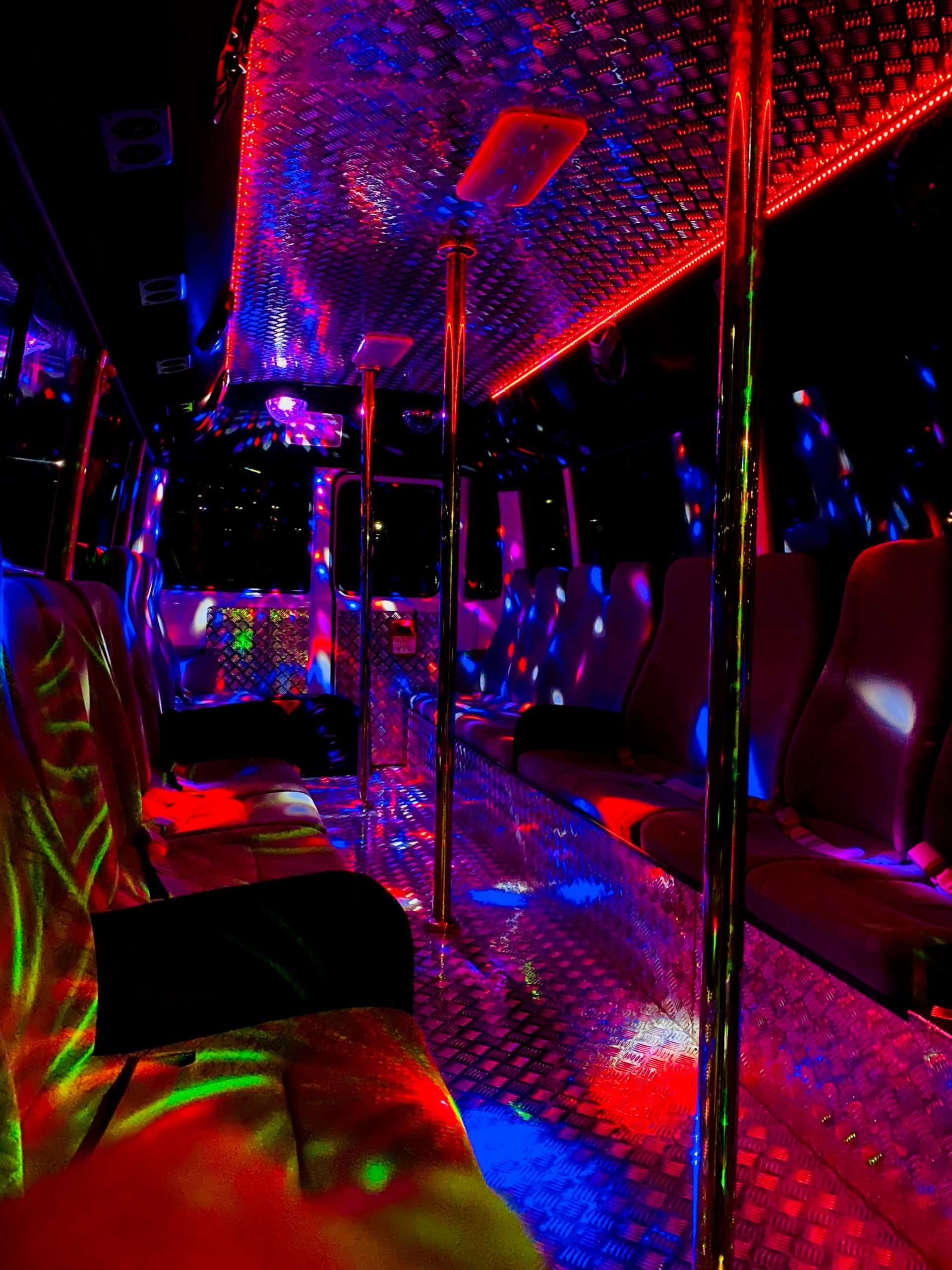 Why try to squeeze 12 people into a limo and basically sit still until you reach your destination? Boring! Wouldn’t you much rather spend your time partying with ALL your friends and their dates on a sleek bus with tinted windows and an interior that looks, feels and sounds like a nightclub?