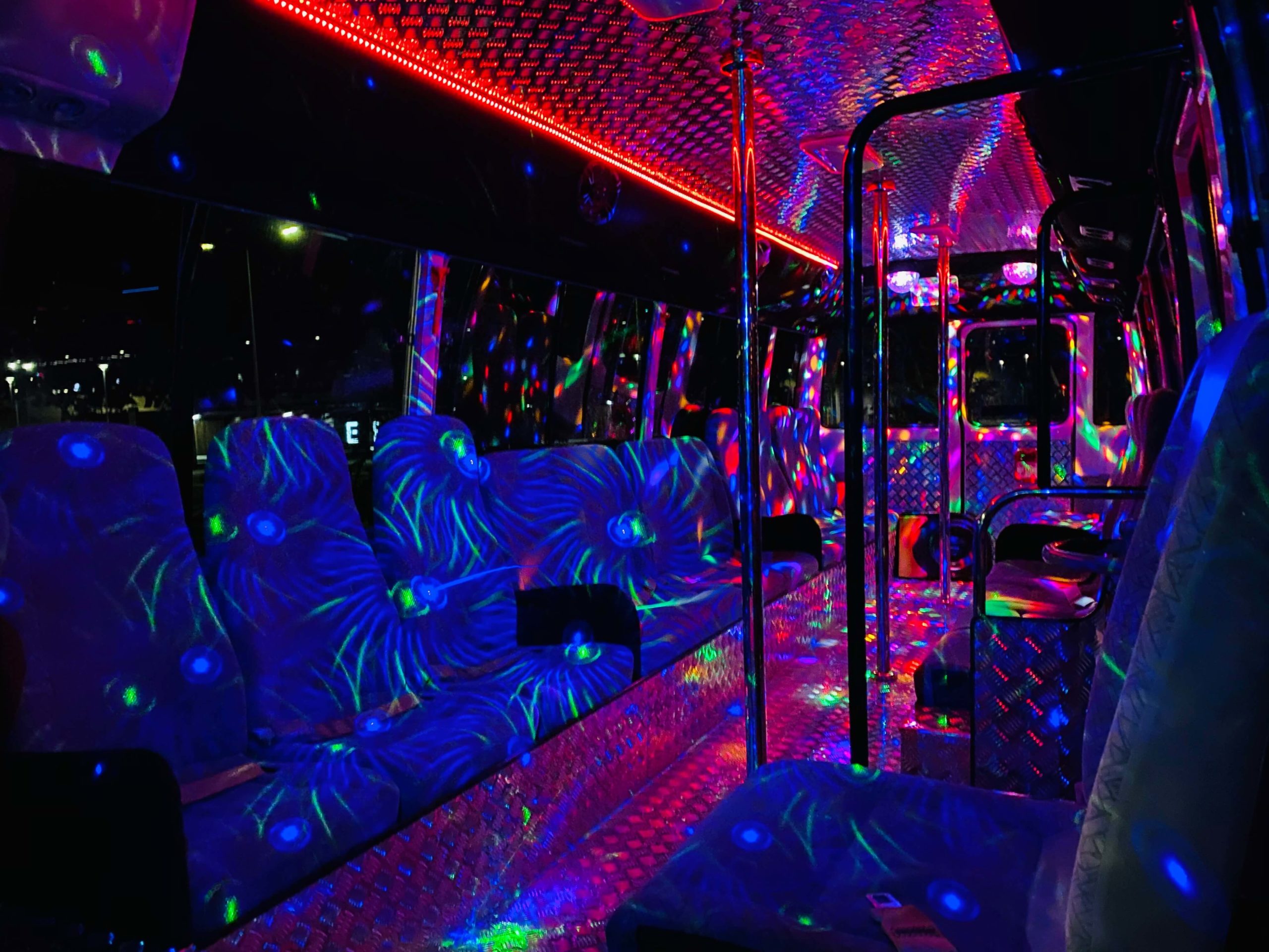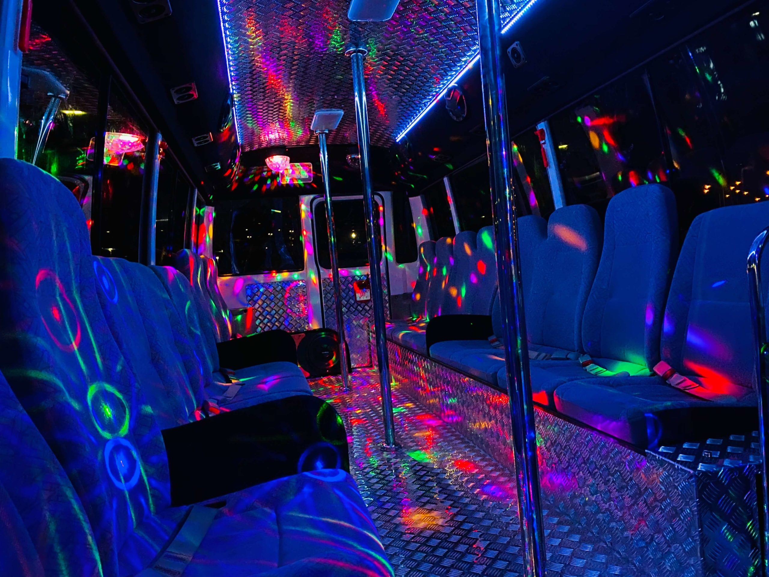 Our party buses have a huge dance floor with dance poles and heaps of room to move around and dance to the music. The sound system is out of this world, with 10 speakers throughout the bus and 3 subwoofers that’ll make you FEEL those beats. There’s a smoke machine as well as advanced lighting, including cool strobe lights and laser lights, flashing along to your music.